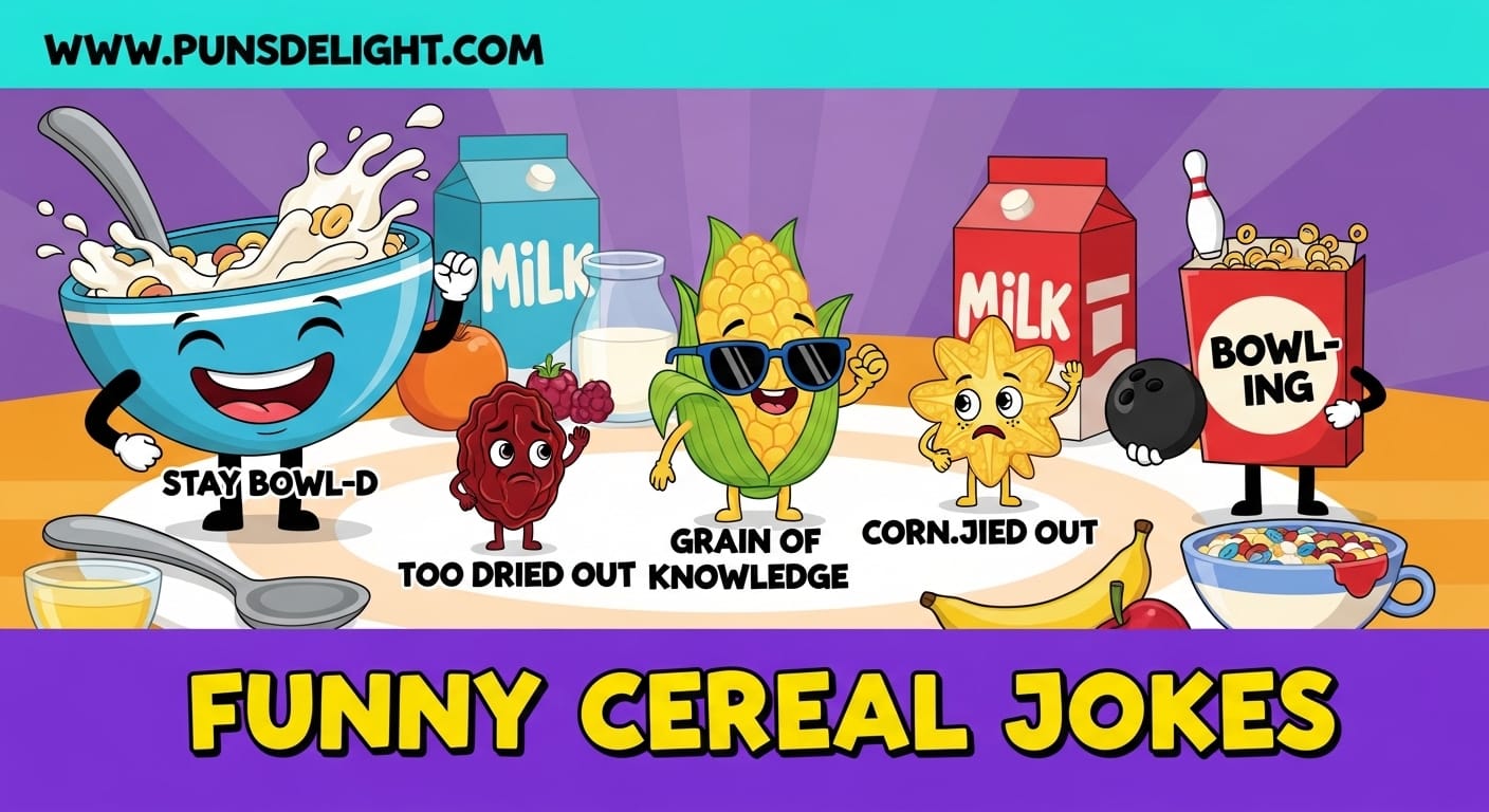 The funniest cereal puns play on words like crunch, flakes, grain, and milk, using simple wordplay that’s quick and easy to laugh at.